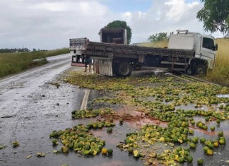 Caminhão com carga de laranja tomba na AL 220 em Barra de São Miguel