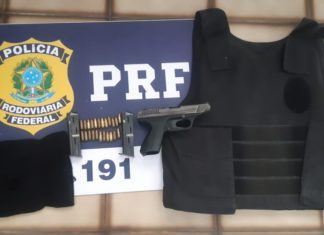 Uma pistola 9mm com mais de 60 munições foi apreendida pelos policiais, além de um colete à prova de balas e uma balaclava