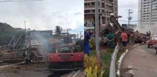 Carreta com retroescavadeira tomba e pega fogo na Rota do Mar...
