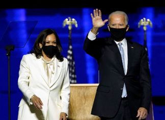 Democratic vice-presidential nominee Kamala Harris and Democratic 2020 U.S. presidential nominee Joe Biden greet supporters at an election rally, after news...