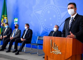 Autor do projeto que deu origem à lei, Rodrigo Pacheco (em pé) participa da cerimônia de sanção