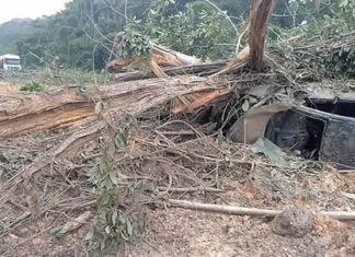 Um carro de passeio foi atingido pela terra e pedaços de árvores