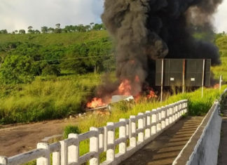 Carreta tomba e pega fogo na cabeceira da ponte da Sinimbú; PRF, SAMU e...