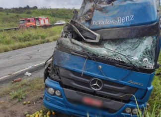 Caminhão com carga de laranjas tomba e interdita a BR 101 em Joaquim Gomes