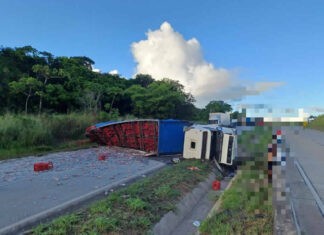 Carreta tomba e espalha carga de refrigerante na BR 101 em São Miguel dos...
