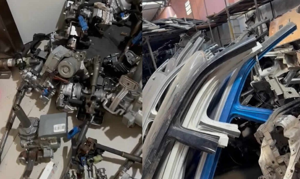 Durante a ação, os policiais também encontraram grande quantidade de peças automotivas, como motores, caixas de marcha, câmbios, carcaças e diversas placas de veículos, tanto no galpão quanto em um imóvel vizinho, indicando a possível existência de um desmanche de veículos.