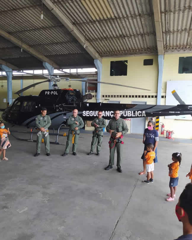 Mais de 20 crianças tiveram um dia muito especial. Eles conheceram os helicópteros de trabalho policial e de resgate. São os chamados falcões da Segurança Pública. Um momento inesquecível para essa turminha que ficou conhecendo os equipamentos usados pelos policiais e pelos bombeiros que tripulam as aeronaves.