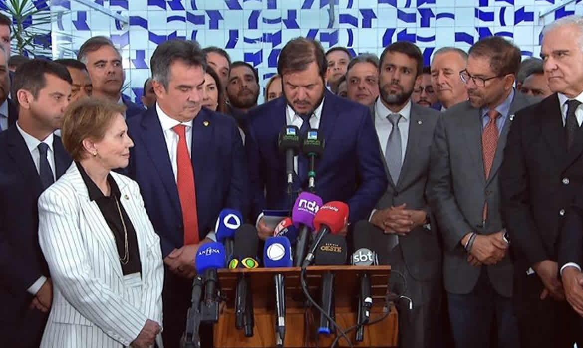 Lideranças da federação se reuniram no Salão Verde da Câmara para anunciar a decisão. O presidente do União Brasil, Antonio Rueda, leu uma nota ao lado do presidente do PP, senador Ciro Nogueira (PI).