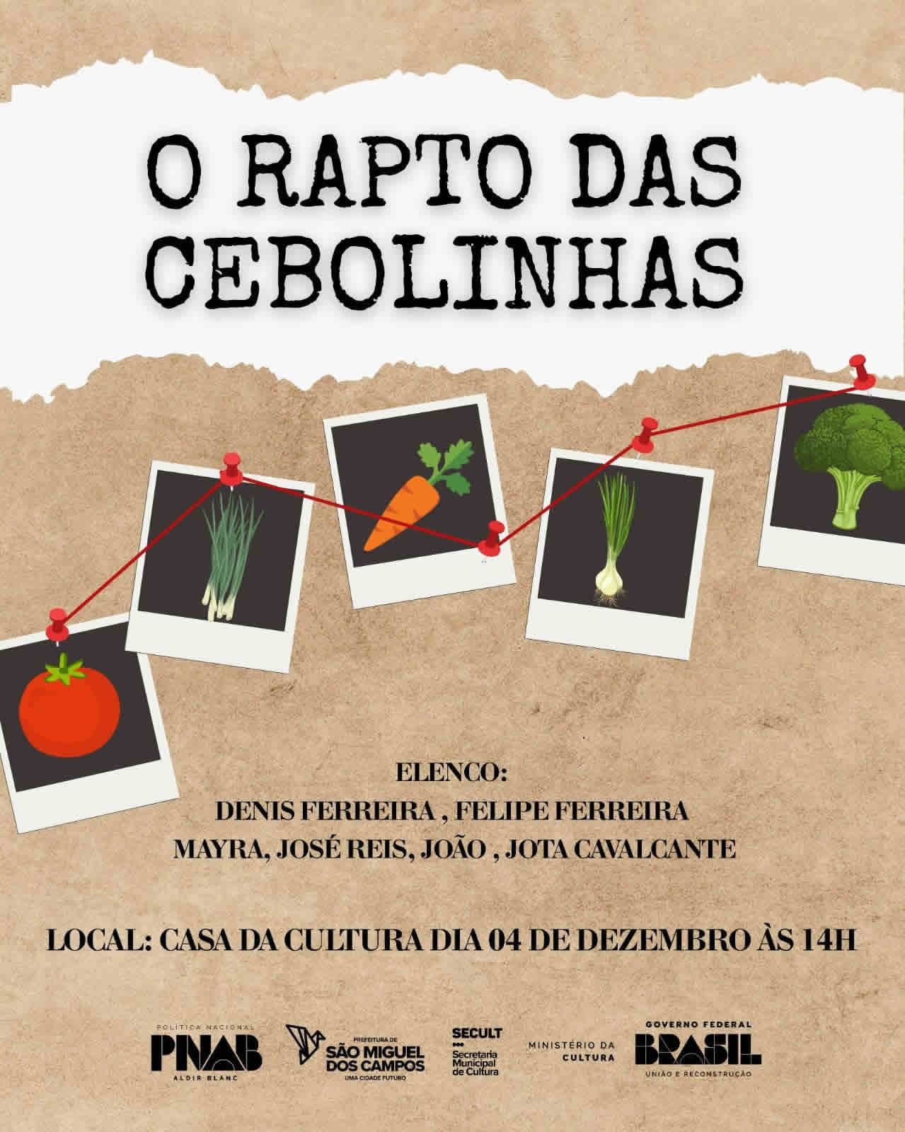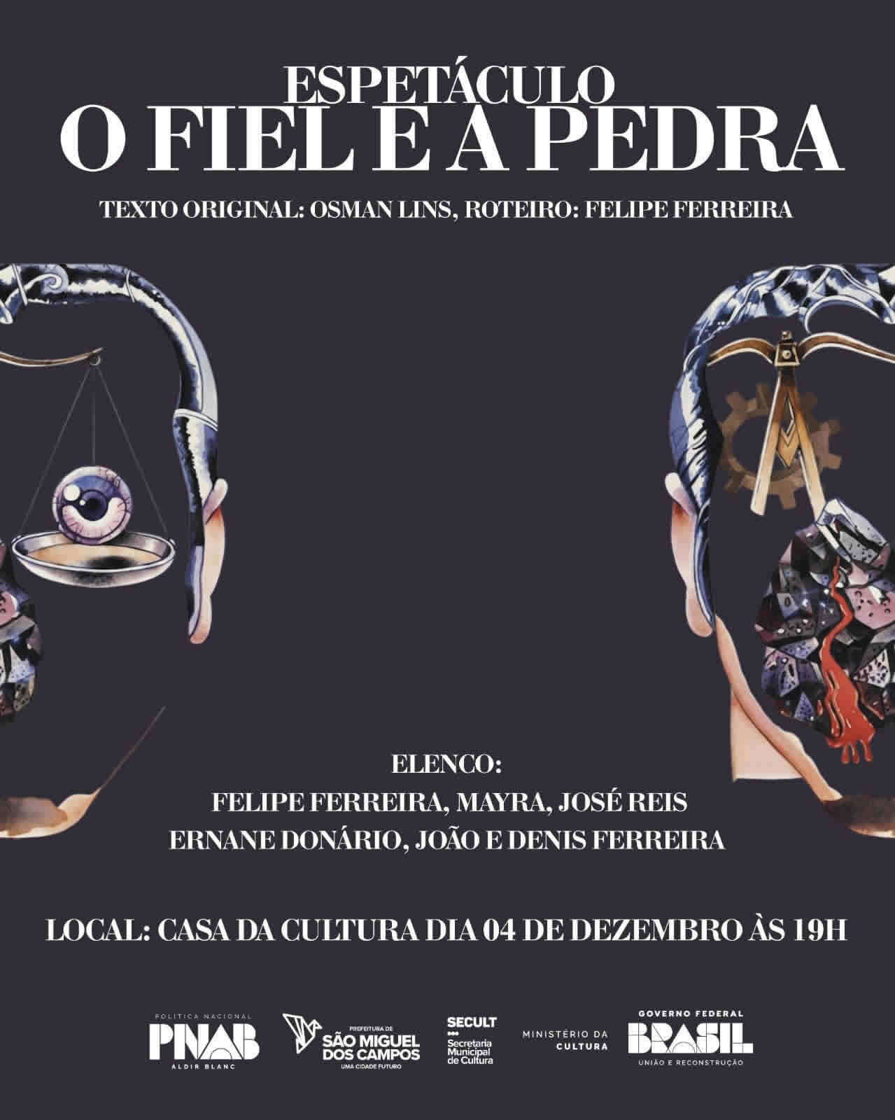 Já na quinta-feira, 4 de dezembro, a programação começa mais cedo: às 14h, com a divertida peça “O Rapto das Cebolinhas”, voltada especialmente ao público infantil. O encerramento será às 19h, com o “Espetáculo O Fiel e a Pedra”, proporcionando mais uma noite de arte e cultura.