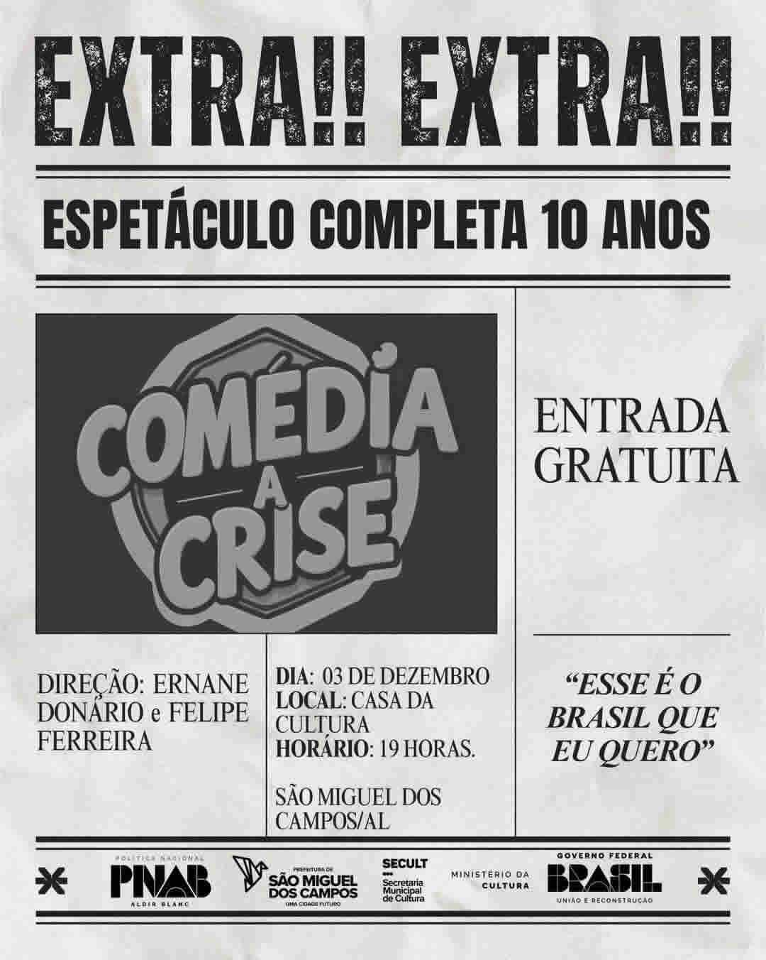 Na quarta-feira, 3 de dezembro, também às 19h, o público confere o espetáculo “A Crise – 10 anos”, que celebra uma década de história nos palcos.