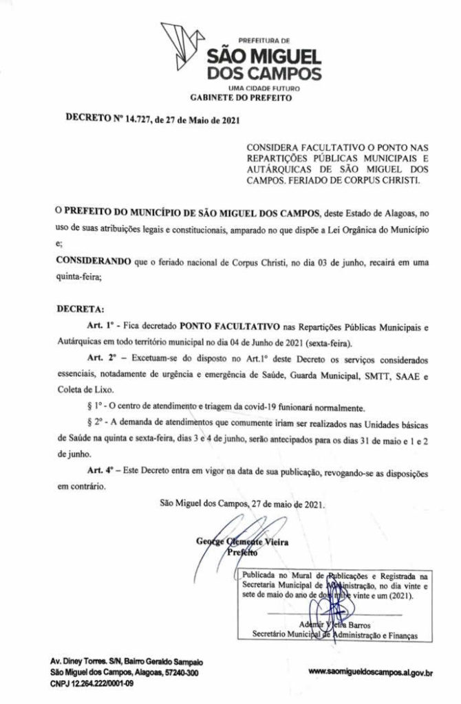 A Prefeitura de São Miguel dos Campos anunciou, na manhã desta quarta-feira (02), que, devido ao feriado de Corpus Christi na próxima quinta-feira (03), foi decretado ponto facultativo na sexta-feira (04).