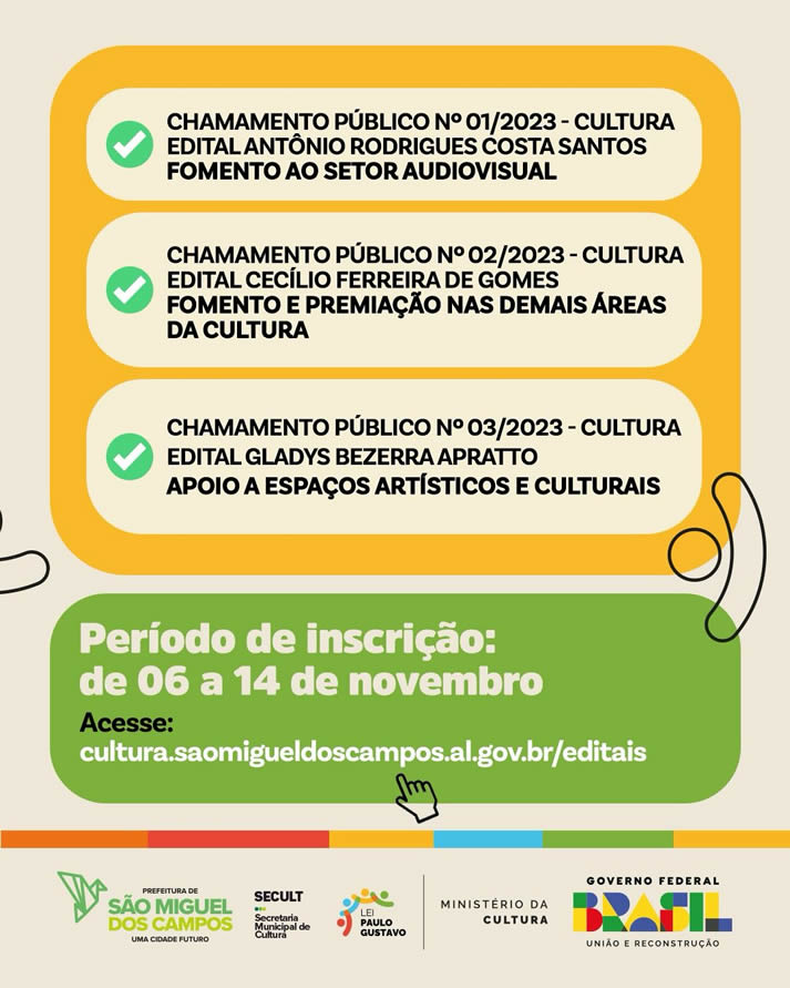A Prefeitura Municipal de São Miguel dos Campos, através da Secretaria Municipal de Cultura, lançou na última sexta-feira, 03 de novembro, os editais que farão o repasse dos recursos da Lei Paulo Gustavo a artistas, grupos e espaços culturais. Ao todo, mais de meio milhão de reais serão investidos no setor cultural, para premiação e fomento de ações de artistas, grupos e espaços culturais.