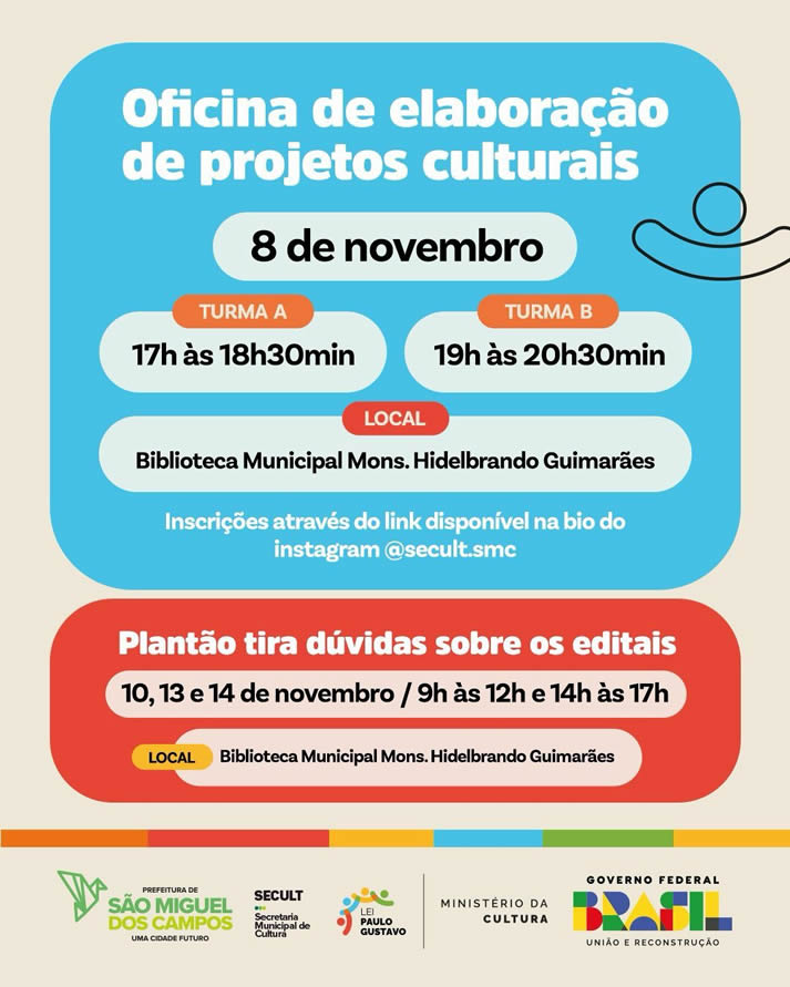 Para auxiliar os agentes culturais no entendimento dos editais e inscrição, a Secretaria Municipal de Cultura divulgou que estará realizando no dia 8 de novembro oficinas gratuitas de elaboração de projetos culturais, presencialmente na biblioteca municipal Mons. Hidelbrando Guimarães, para participar é necessário realizar inscrição através do link disponível na bio do instagram da Secretaria (Secult.smc), e nos dias 10, 13 e 14 de novembro o Plantão Tira Dúvidas.
