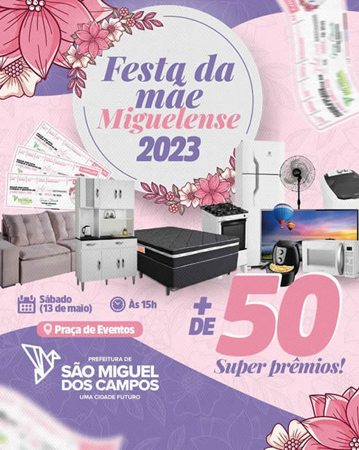 Toda mãe merece carinho, respeito, amor e… prêmios! Quem não gosta, né, verdade?! E no próximo sábado, 13 de maio, véspera do Dia das Mães, a Prefeitura de São Miguel dos Campos promoverá um Festival de Prêmios: a “Festa da Mãe Miguelense” 2023, a partir das 15h, na Praça Multieventos.