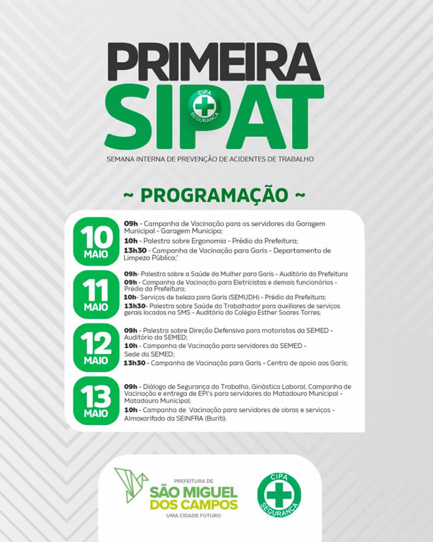 A Prefeitura de São Miguel dos Campos, através da Secretaria Municipal de Administração, juntamente com a CIPA, promoverão a “Semana Interna de Prevenção de Acidentes no Trabalho”, de 10 a 13 de maio.