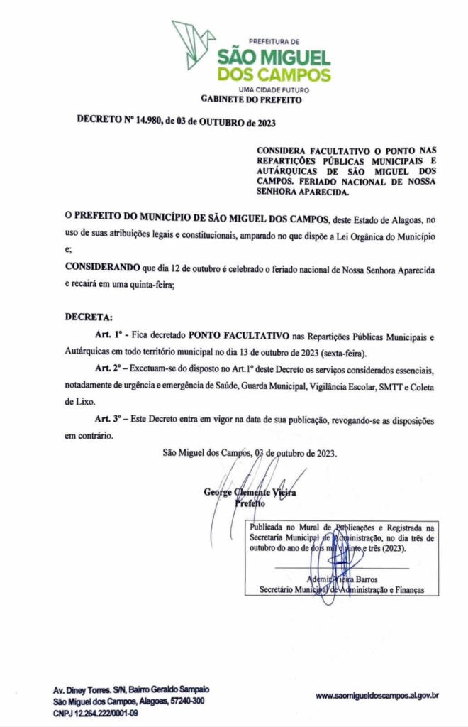 A Prefeitura de São Miguel dos Campos anunciou, nesta quarta-feira (11), que, devido ao feriado de Nossa Senhora Aparecida (padroeira do Brasil) na quinta-feira (12), foi decretado ponto facultativo na sexta-feira (13).