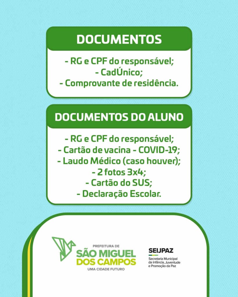 Os responsáveis devem apresentar os seguintes documentos: RG e CPF do responsável, Número do CadÚnico, Comprovante de Residência, RG e CPF do Aluno, Cartão de Vacinação COVID 19, Laudo Médico (caso houver), 2 Fotos 3×4, Cartão SUS e Declaração Escolar.