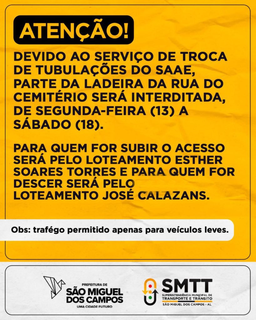 A Prefeitura de São Miguel dos Campos, através da SMTT, informa que devido ao serviço de troca de tubulações do SAAE, parte da ladeira da rua do cemitério será interditada desta segunda-feira (13) a sábado (18).
