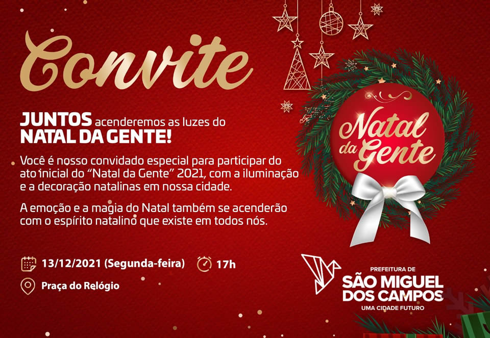 Você é nosso convidado especial para participar do ato inicial do “Natal da Gente” 2021, com a iluminação e a decoração natalinas em nossa cidade.