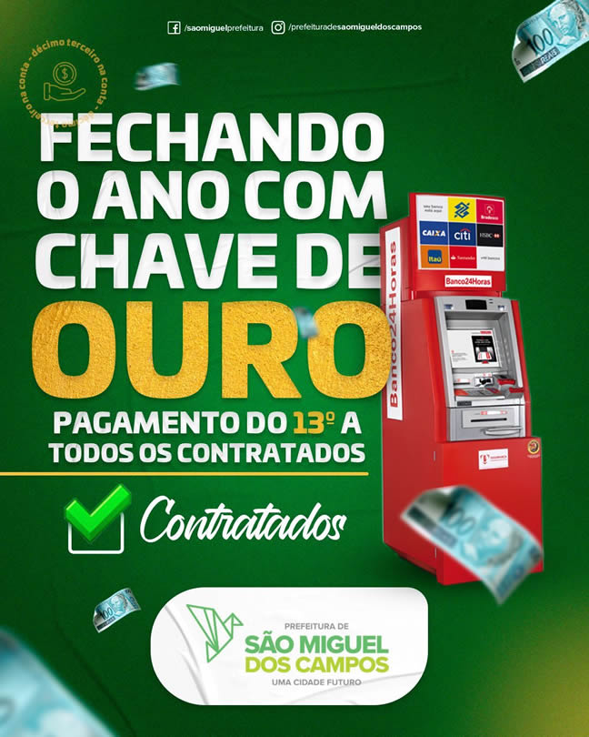 A Prefeitura de São Miguel dos Campos, através da Secretaria Municipal de Administração e Finanças, liberou nesta sexta-feira (17), o 13° salário aos servidores contratados. Na última sexta-feira (10), os demais servidores (efetivos, comissionados, pensionistas e aposentados) já haviam recebido o pagamento.