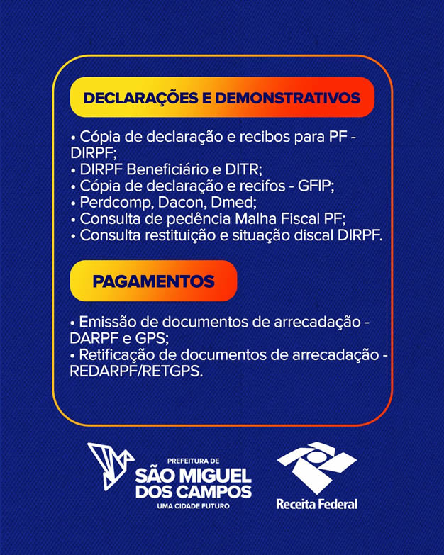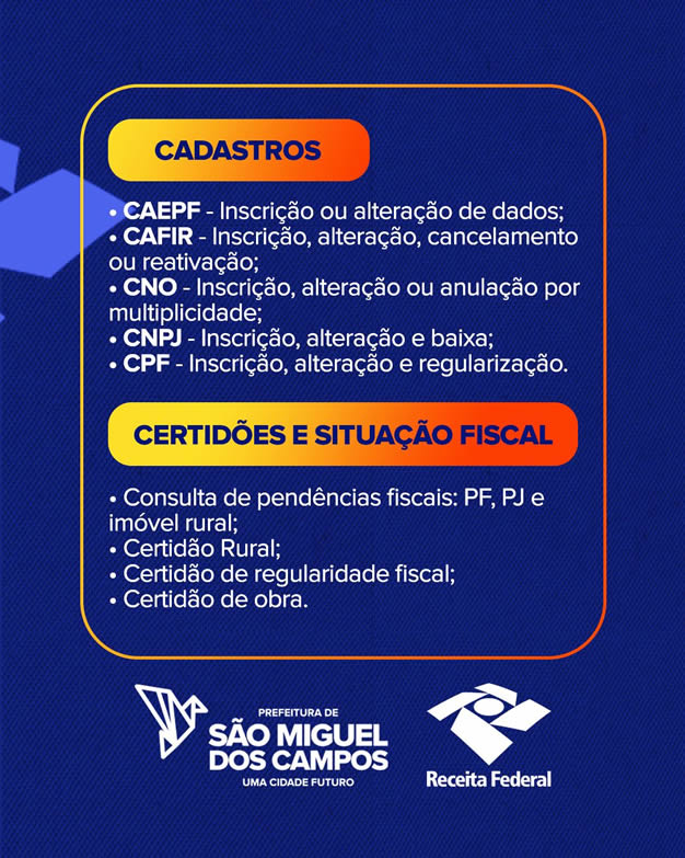 Entre os serviços ofertados estão os seguintes: Cadastros (CAEPF – Inscrição ou alteração de dados; CAFIR – Inscrição, alteração, cancelamento ou reativação; CNO – Inscrição, alteração ou anulação por multiplicidade; CNPJ – Inscrição, alteração e baixa; CPF – Inscrição, alteração e regularização); Certidões e situação fiscal (Consulta de pendências fiscais: PF, PJ e imóvel rural; Certidão Rural; Certidão de regularidade fiscal; Certidão de obra); Declarações e demonstrativos (Cópia de declaração e recibos para PF – DIRPF; DIRPF Beneficiário e DITR; Cópia de declaração e recifos – GFIP; Perdcomp, Dacon, Dmed; Consulta de pedência Malha Fiscal PF; Consulta restituição e situação discal DIRPF); Pagamentos (Emissão de documentos de arrecadação – DARPF e GPS; Retificação de documentos de arrecadação – REDARPF/RETGPS); Processos e Procuração (Conversão de processo eletrônico para digital; Cópia de processos (Exceto de PJ lucro real/ Presumido/Arbitrado); Juntada de documentos; Impugnação, recurso, manifestações de incoformidade, Procuração RFB).
