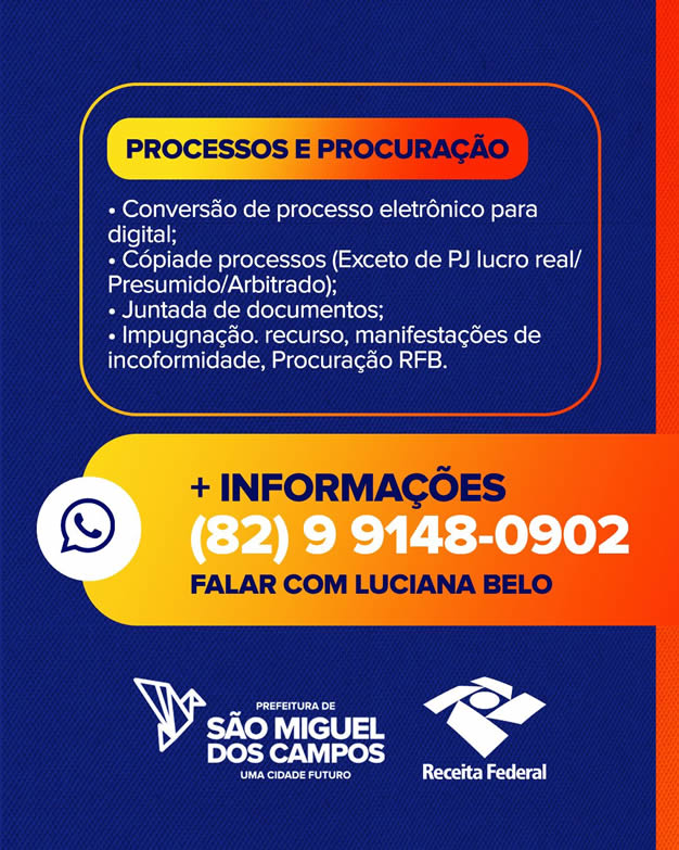 A sala da Receita Federal funciona de segunda a sexta-feira, das 08 às 14h, na sede de SEDECTI (em frente ao Unicompra do Centro). Para maiores informações, entrar em contato através do número: (82) 99148-0902.