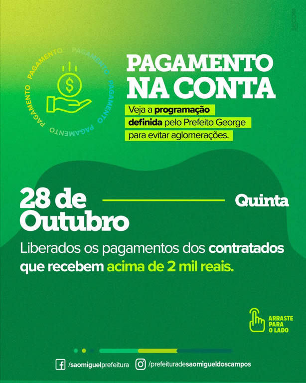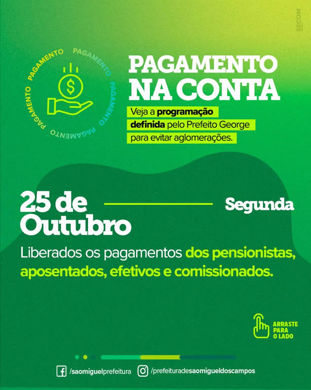 Seguindo o cronograma e priorizando, mais uma vez, a saúde e o bem-estar de cada miguelense, a Prefeitura de São Miguel dos Campos começará a pagar os servidores nesta segunda-feira, dia 25 de outubro. A partir das 14h, os salários serão liberados, para evitar aglomeração através de filas no banco.