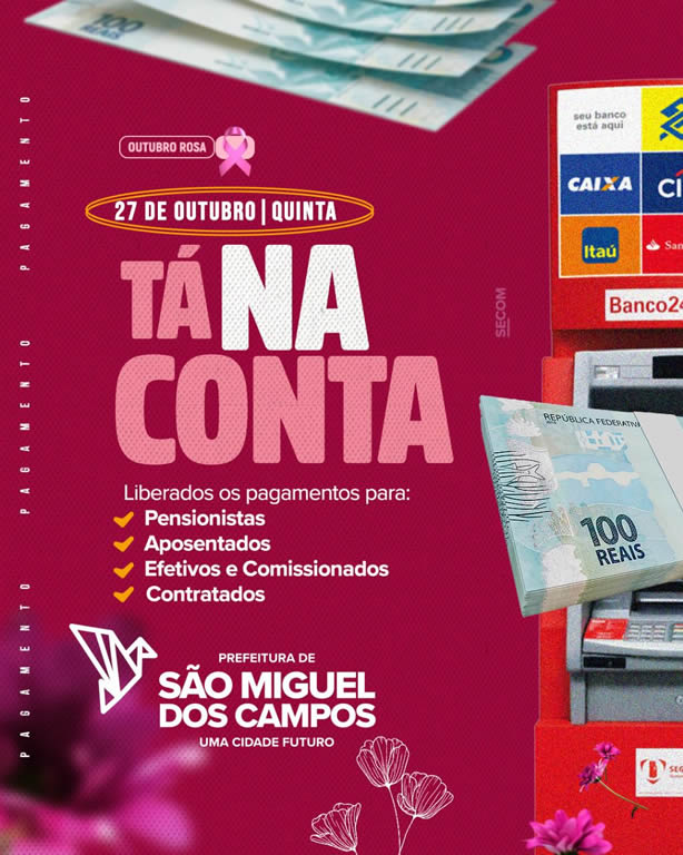 No próximo dia 28, será comemorado o Dia do Servidor Público, e a Prefeitura de São Miguel dos Campos, através da Secretaria Municipal de Administração e Finanças, anunciou que o pagamento de todos os servidores públicos (efetivos, comissionados, contratados, aposentados e pensionistas) será nesta quinta-feira, dia 27 de outubro.